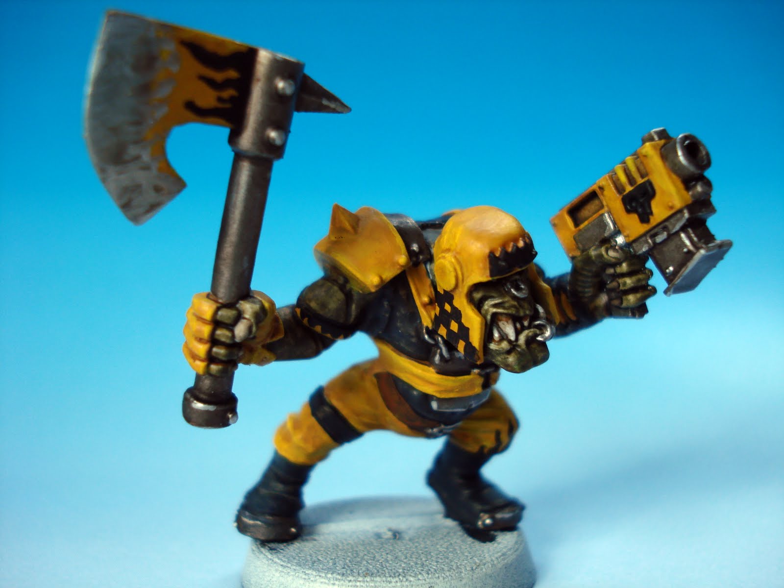 Ogryn flesh lepiej wyglada, moim zdaniem. Troche za duzo zoltego na tych orkach. Owszem to ich dominujacy kolor ale nie jedyny. Dobrze na tym wygladaja plomienie, tak porobiles czarne ale biale tez moga byc.